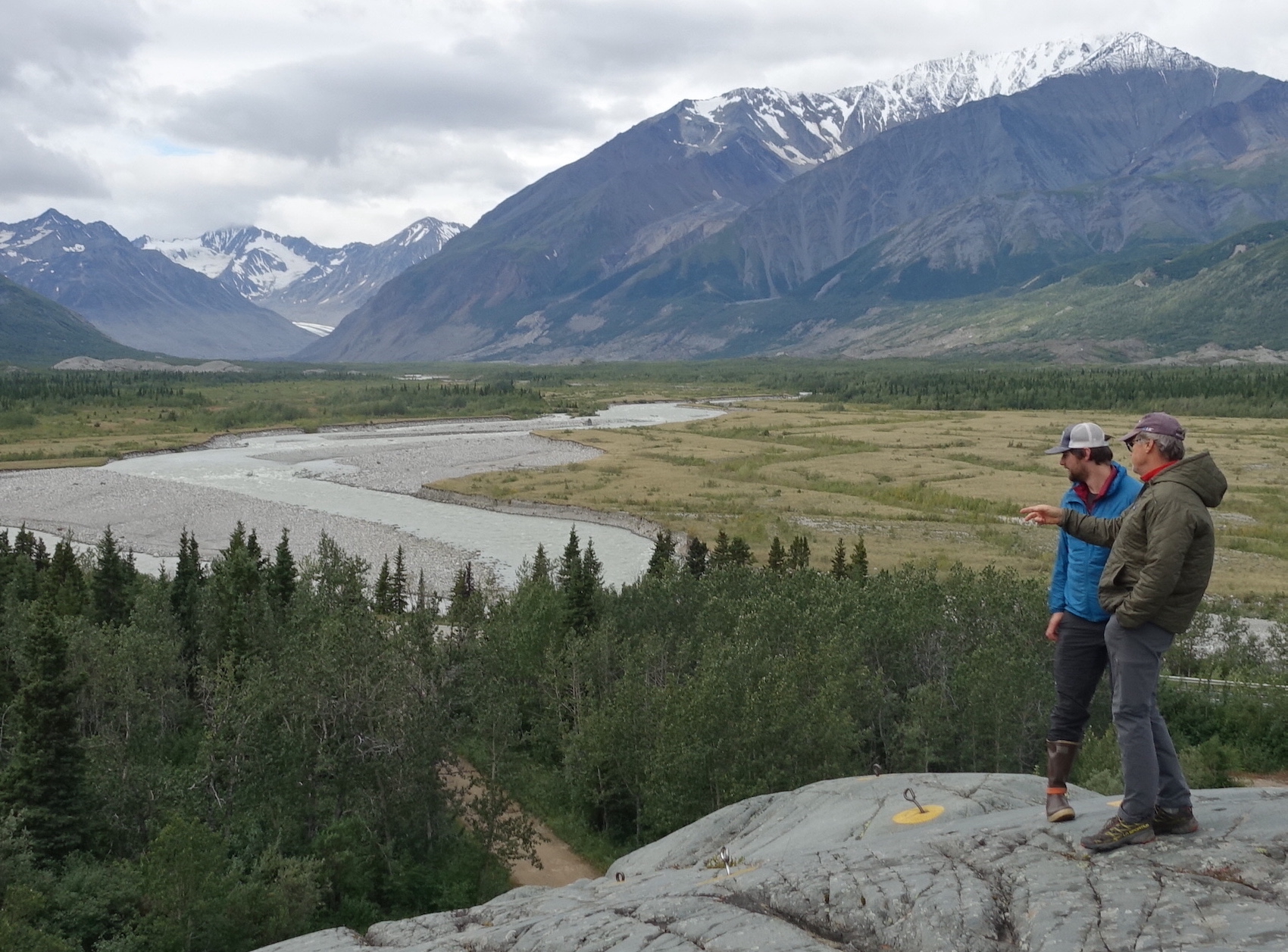 Phillip Wilson, in the blue jacket, and Dan Mann stand on a rock outcrop that was scoured by floodwaters a few centuries ago when Black Rapids Glacier — far in the distance — advanced to dam the Delta River.