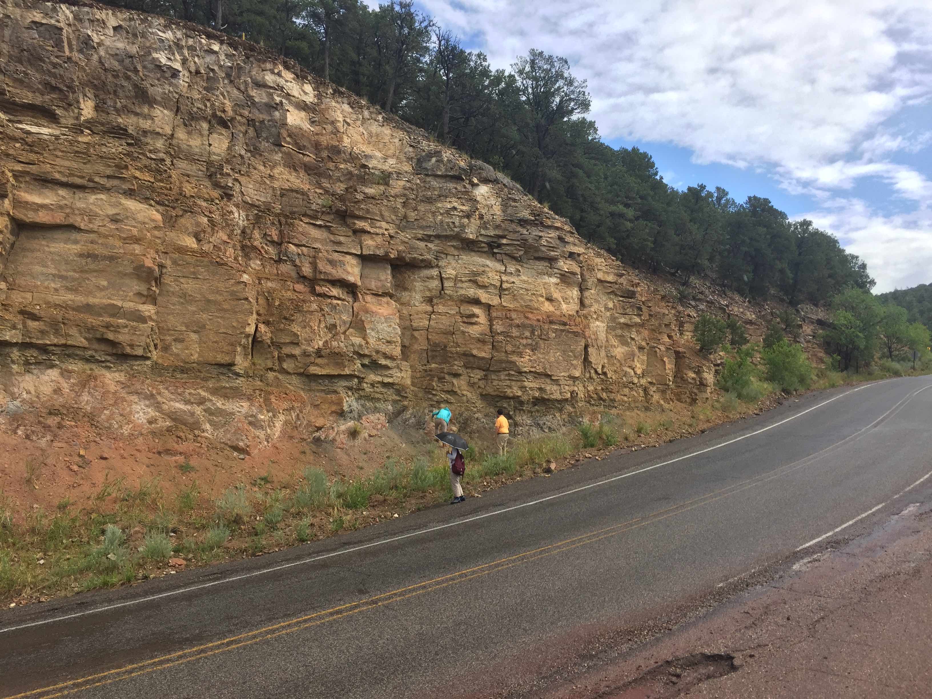 Geologists inspect an outcrop near the sample collection site in New Mexico.