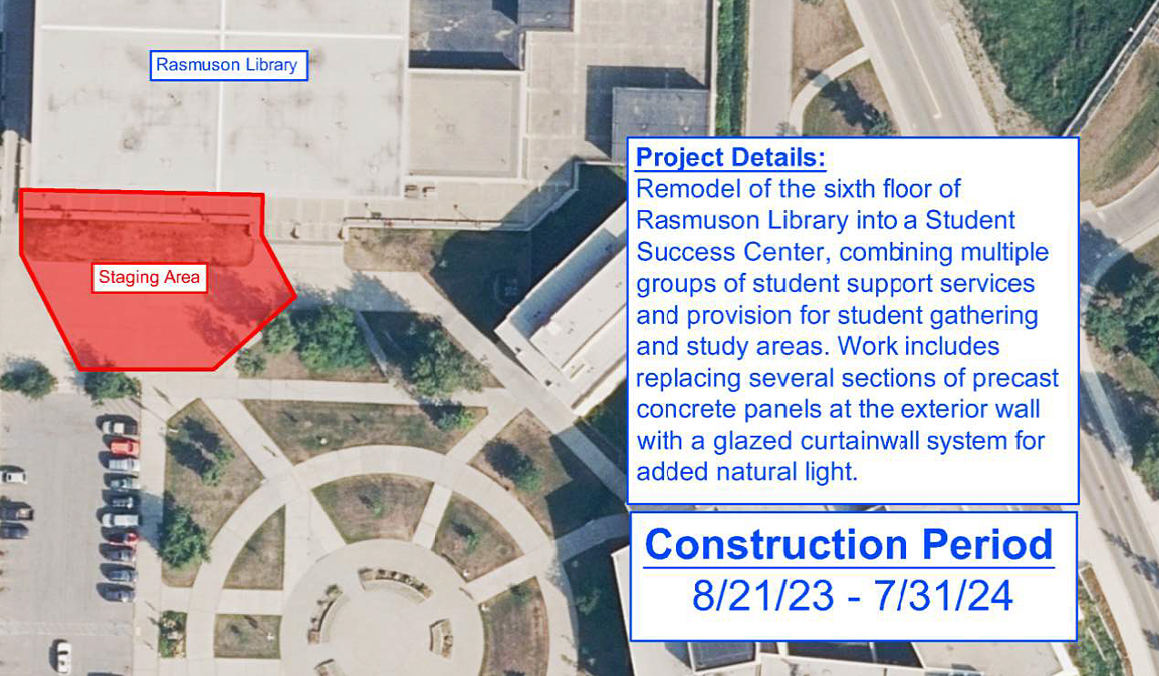 Construction on the new UAF Student Success Center will kick off on Monday, Aug. 21. Contractors from GHEMM Company, LLC will erect fencing around the south side of the Rasmuson Library to serve as their staging area. The walking deck around the library will also be closed. Please be aware of the changes and look out for signage.