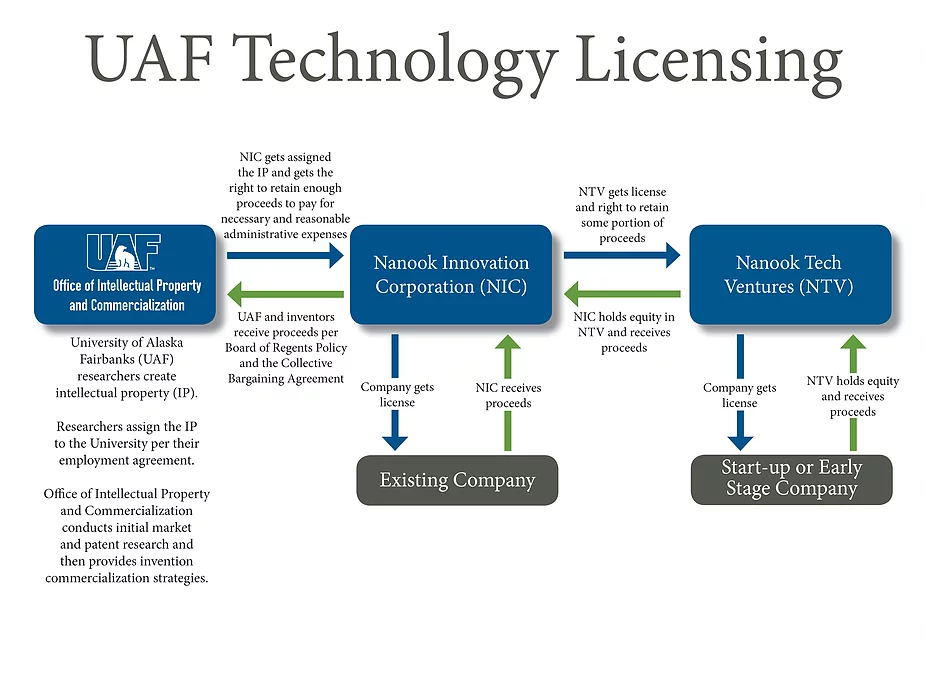 The University works with Nanook Innovation Corporation to commercialize technology. The structure is diagrammed below. To get the process started, however, contact OIPC.
