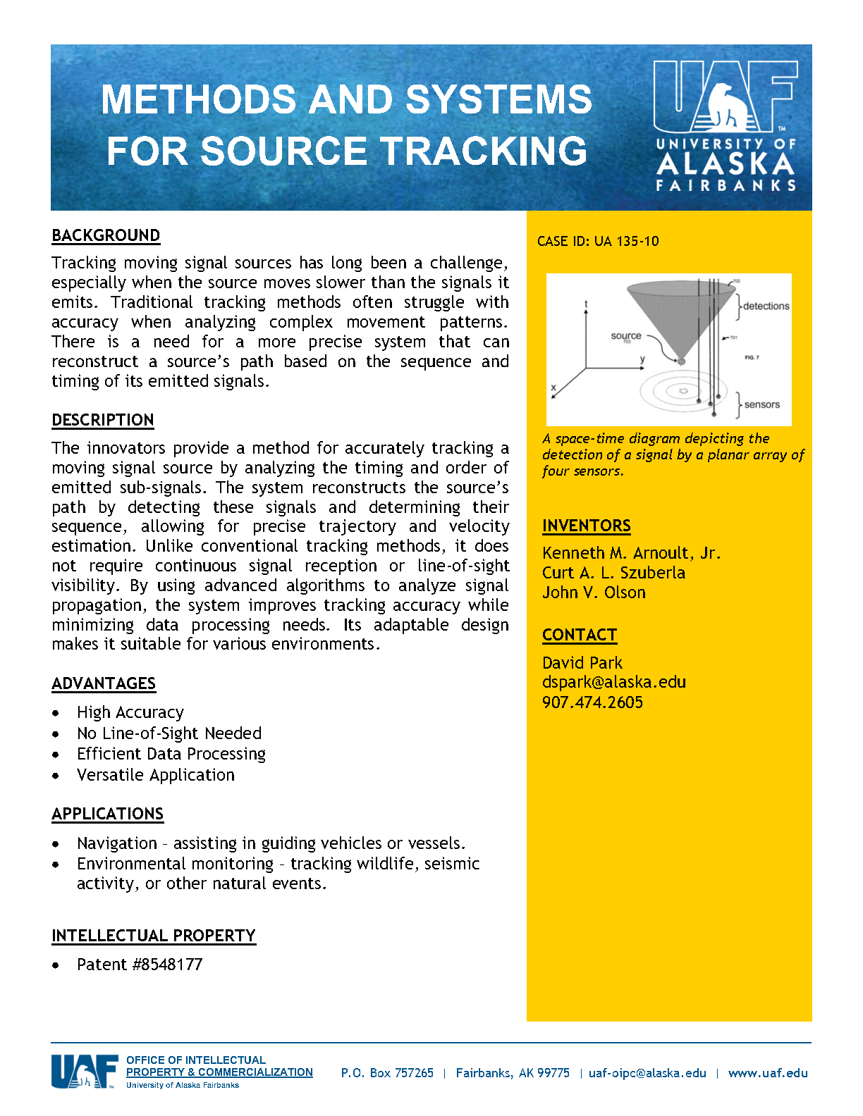 The Signal Source Tracking method detects signals emitted from different positions as a source moves. By analyzing the sequence and timing of these signals, the technology estimates the source's path and speed, enabling precise movement tracking.