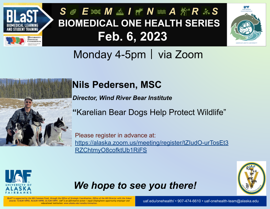 Nils Pedersen grew up with sled dogs in Fairbanks, Alaska. He understood the utility of working dogs for bear deterrence at a young age because of a photo that his grandpa showed him of one of his Greenland Husky dogs chasing a young polar bear away from camp. Pedersen began working with the Wind River Bear Institute (WRBI) in 2011 as the trainer and handler of Karelian Bear Dog, “Soledad”. Together they have worked to address human-bear conflict issues with all three species of North American bear: grizzly, black, and polar bear. Pedersen completed a M.Sc. degree in Wildlife Biology and Conservation from the University of Alaska Fairbanks in 2019. His research focused on human-grizzly bear conflict in the North Slope oil fields of Alaska and the use of Forward Looking Infrared-equipped drones for grizzly and polar bear den detection in the Arctic. Pedersen owns and operates the WRBI kennel in Fairbanks, Alaska. In his spare time he guides for Arctic Dog Adventure Co., an ecotourism dog mushing company he founded together with his partner, Lisbet Norris.