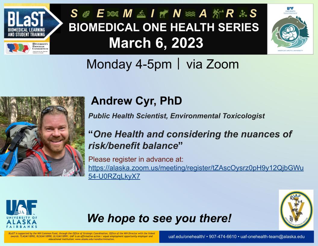 Andrew Cyr is an environmental toxicologist for the State of Alaska Department of Health. He earned his Ph.D. from the University of Alaska, Fairbanks in 2019, where he researched the chemical feeding ecology of mercury in fish and aquatic food webs across Alaska. He has a background in environmental consulting, natural resource management, science mentoring, education, outreach, and research in environmental toxicology and human health. He is a passionate supporter of public health, especially through the One Health paradigm. Health is an intricate compilation of nutrition, physical health, mental well-being, cultural health, as well as one’s interaction with their surrounding environment. Ensuring that we are promoting all aspects of health requires collaboration with numerous disciplines, including clinicians, local community members, researchers, and public health officials. Andrew works diligently to ensure that the development of public health guidance considers health holistically – i.e., as more than the presence or absence of a disease – and, when considering exposure to a potentially hazardous substance, balances the risks and benefits.