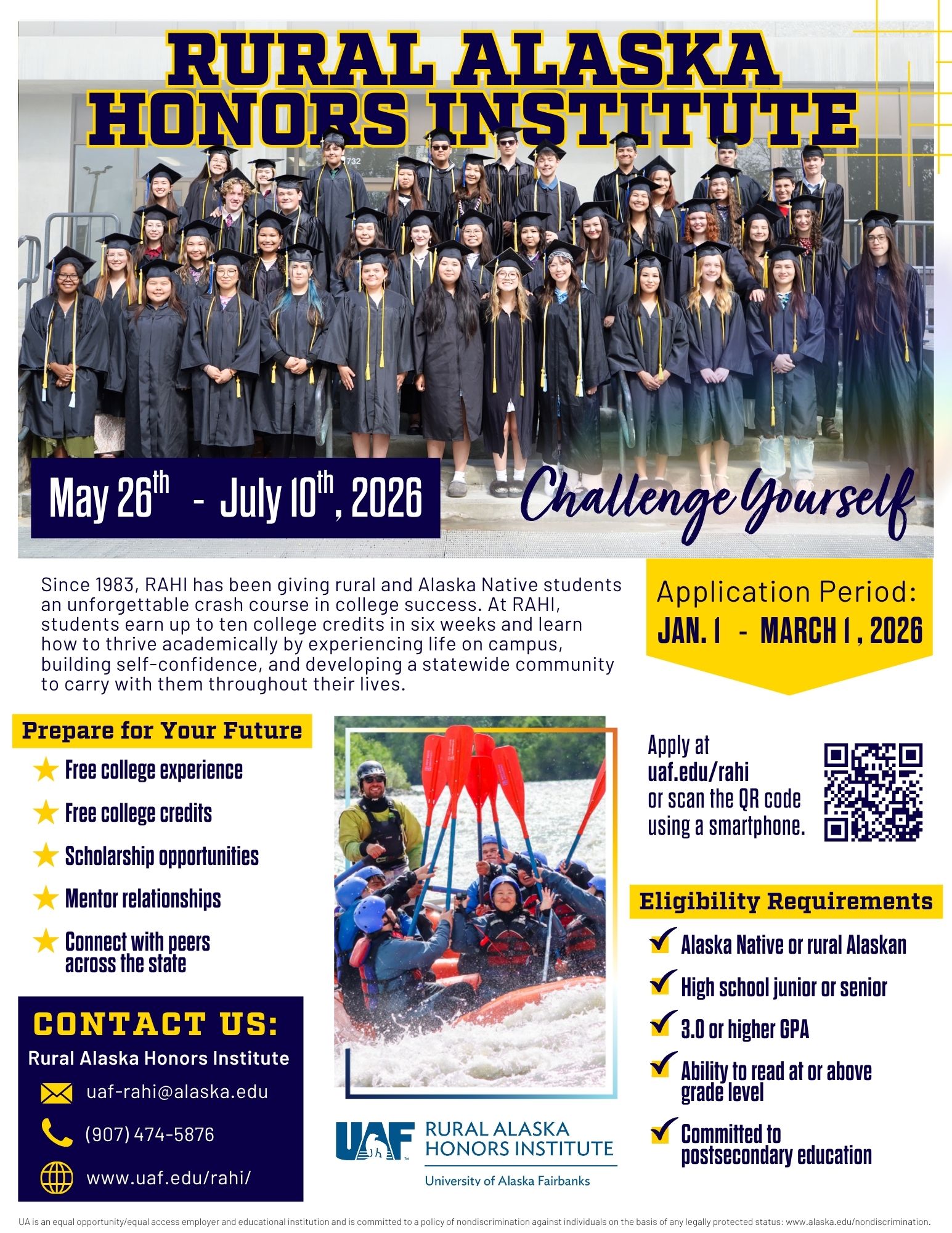 We are excited to share an amazing opportunity for high school juniors and seniors: Rural Alaska Honors Institute (RAHI)!
