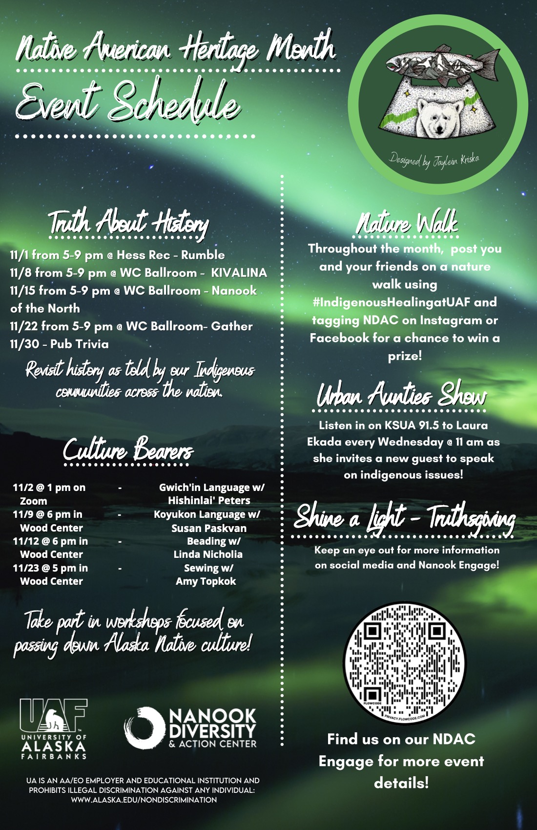 Wear it Wednesday: Every Wednesday in November, wear your traditional clothing or regalia! Snap a photo, tag @uafindigenous and #WearItWednesday!