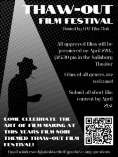 Films of all genres are welcomed. Priority will be given to UAF Student films made within the last year, all other films will be considered as space allows. All genres of film will be accepted for review including documentary, animation and experimental.