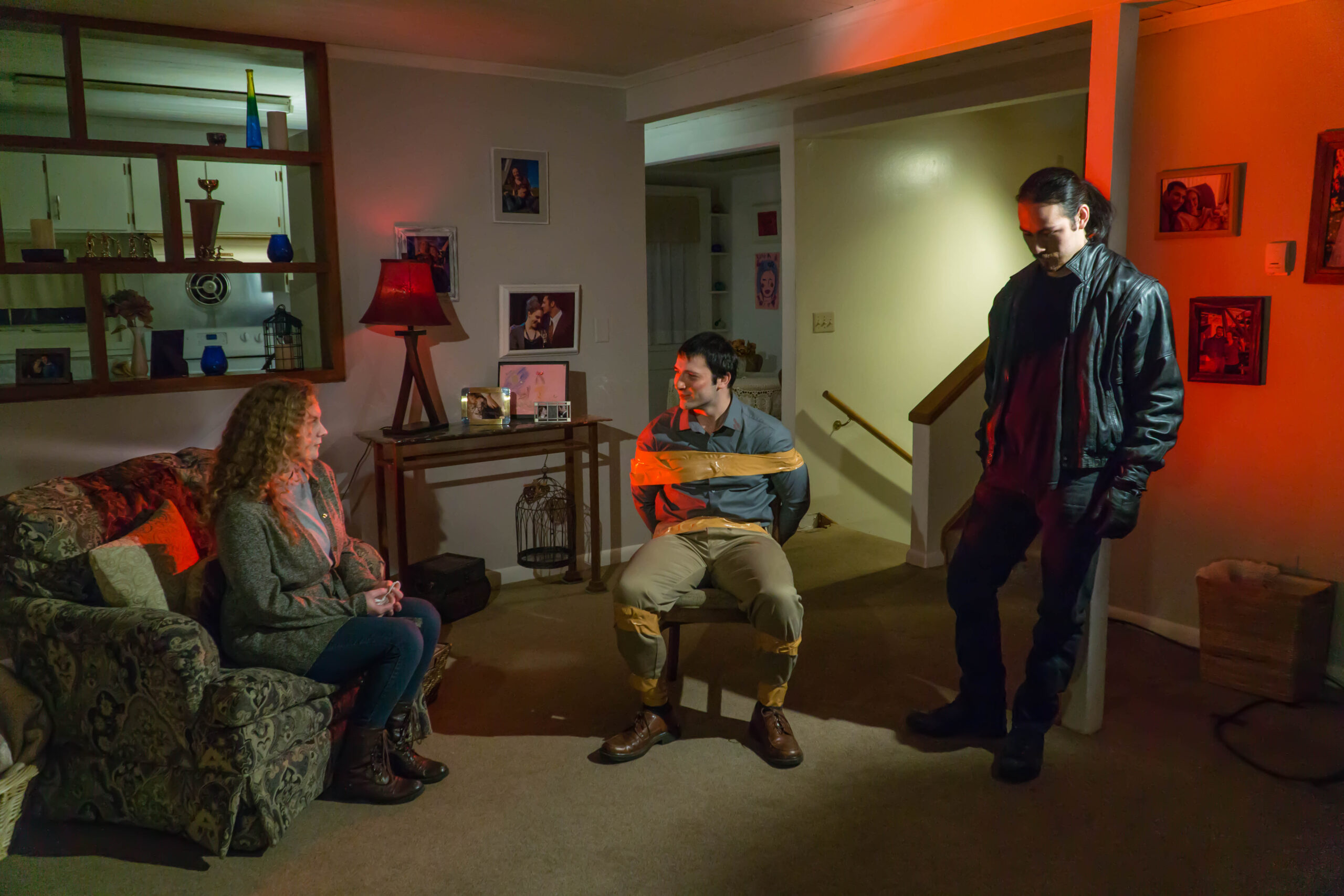Image shows (left to right) Mary Conlin, Darren Napoli and Jared Olin performing a scene during the filming in the Banner House for "A Night for Conversation".