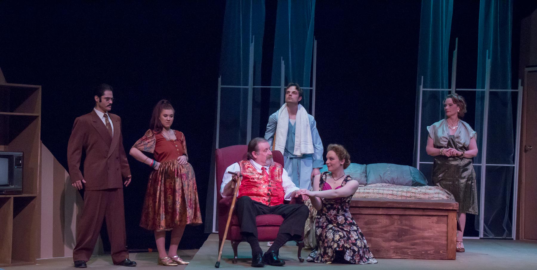 L-R: Thomas Petrie as Gooper, Katrina Kuharich as Mae, Steve Mitchell (sitting) as Big Daddy, Jaron Carlson as Brick, Mary Conlin as Maggie and Siri Tuttle as Big Momma in Theatre UAF's "Cat on a Hot Tin Roof" April 15-24, 2016