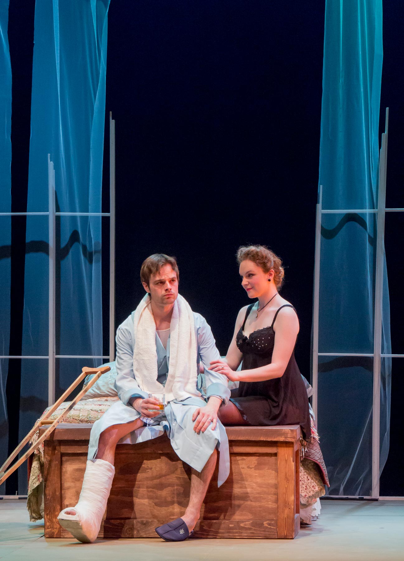 Mary Conlin as Maggie and Jaron Carlson as Brick in "Cat on a Hot Tin Roof" by Tennessee Williams, directed by Rebecca George and Produced by Theatre UAF, April, 2016