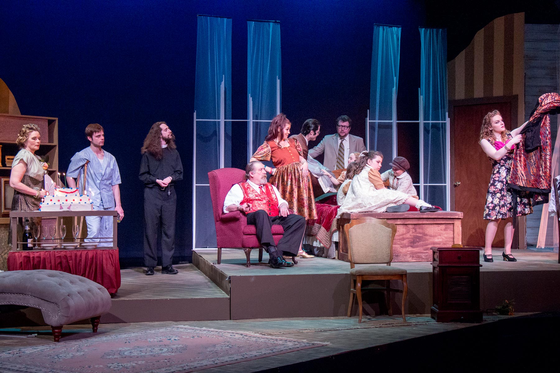 Steve Mitchell as Big Daddy (sitting), Katrina Kuharich as Mae, Thomas Petrie as Gooper, Michael Shaeffer as Doc Baugh, the children on the bed (Josie